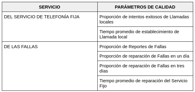 VINOC presta los servicios públicos de telecomunicaciones de acuerdo con los siguientes parámetros de calidad: